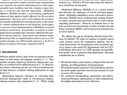 A systems paper on accelerating diffusion inference with fused low-bit kernels and cache-update fusion.