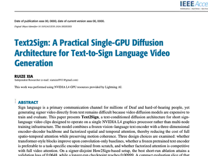 A single-GPU diffusion system for generating short sign-language videos from text prompts.